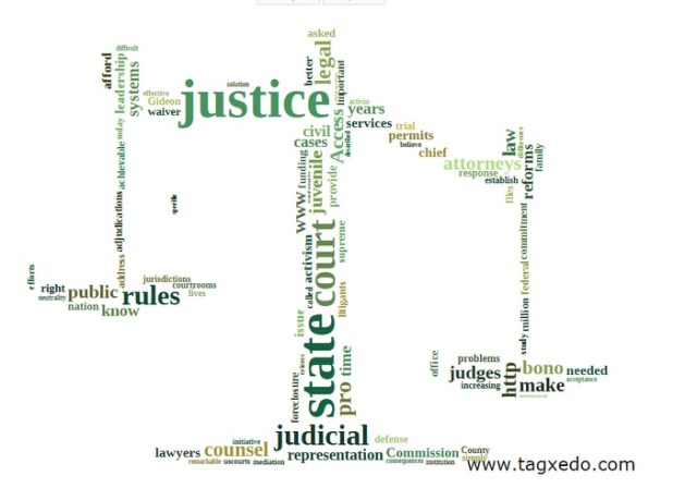 I’ve been fascinated with word clouds for a while and covered a few tools, including Wordle, that people can use to create them in a blog post on techno.la. But my favorite tool is Tagxedo, which I just learned about at the 2011 Nonprofit Technology Conference. Tagxedo allows you to easily specify the shape of the world cloud. I created an example for the speech above in the shape of the scales of justice.