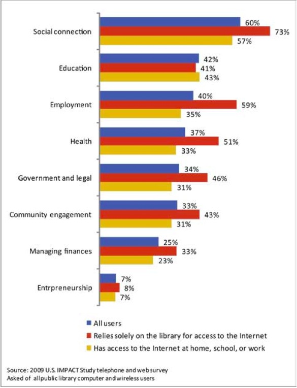 Note how high “Learn about Laws or Regulations” is (top in this area). Also “Look for Advice With Legal Issue” is almost 40%. (It would be good to know how people read the word “advice”. Does this mean we need to build up pro bono referrals, or find ways to have what we call “information” meet more of the need?) Note too the phrase “Get Gov’t Froms” — we need to expand that to include “Complete Government Forms.” Inteestingly, within this general government and legal category, it does not seem to make much difference how much people rely only on libraries for Internet access.