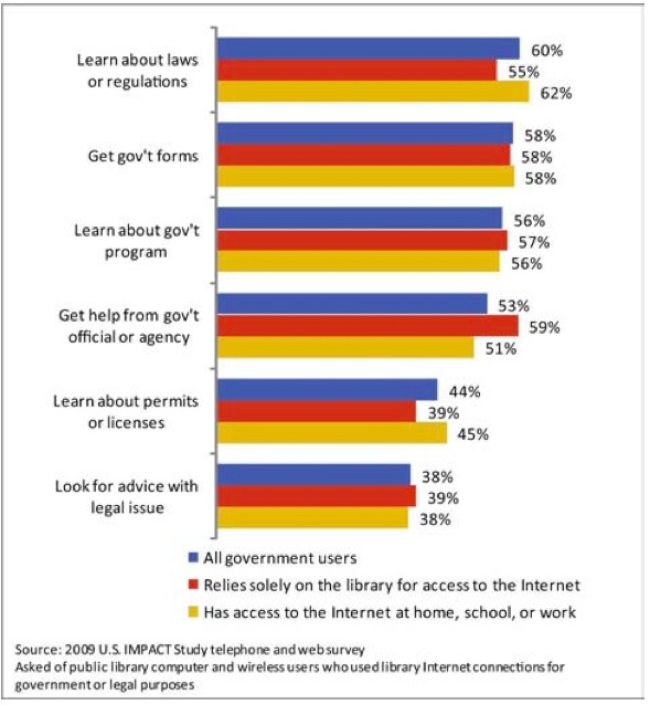 Specifically, the study polled public library users. They found high use for government and legal access (it is nice that legal access was a major part of the study). The chart below, (Figure 8 at page 55) shows not only that this is a significant category, but that it is particularly significant (46%) for those who rely on the library for their internet access — i.e. those with less resources. This emphasizes the wisdom of our library-oriented strategy.