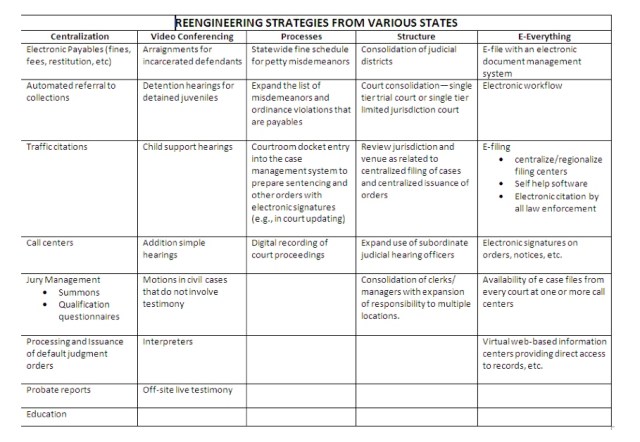 The National Center for State Courts has issued an eleven page complication of ideas for re-engineering.