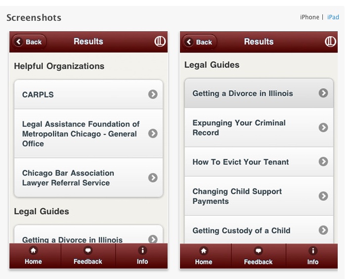 No surprise here, Illinois LegalAid Online remains in the forefront with their iPhone App, downloadable here.