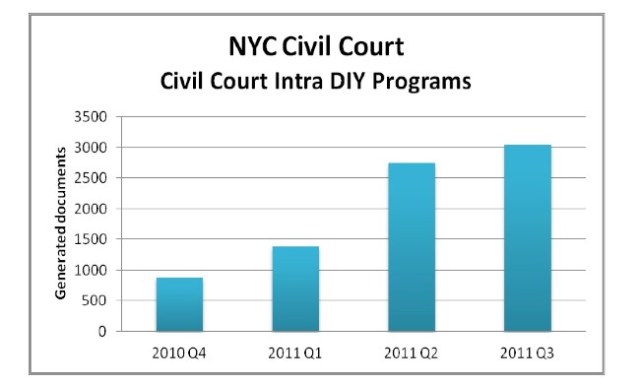 - Extensive DIY outreach and training is very important. There is a direct relationship to the success of their A2J programs and the training of court personnel. Here is the chart showing increase of usage in the NYC Civil Court.