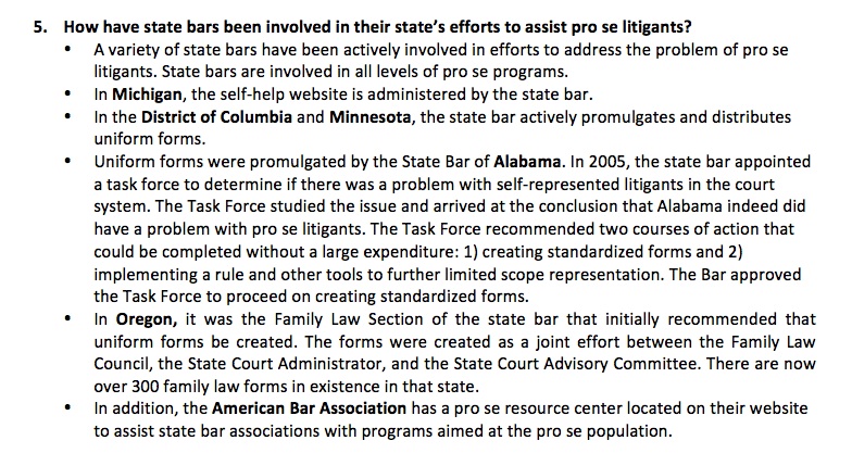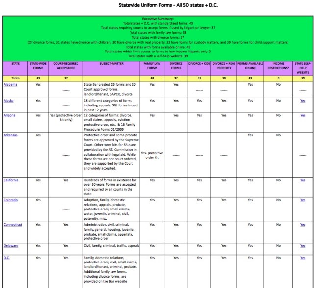 The Texas Access to Justice Commission, during their advocacy for forms in the face of bar opposition, did a wonderful job of surveying states for their availability of forms. Here is a spreadsheet showing the results. Here is a snapshot from the sheet: