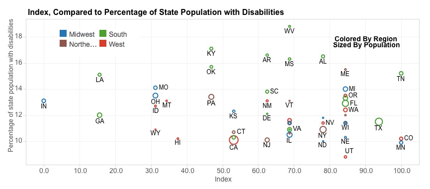 Here is another fascinating counter-intuitive finding. Below is the chart comparing the percentage of state population with the scores. My intuitive read gives me the sense that there is no correlation at all, so this suggests that good policies are not driven by sheer voting power, but by other forces.