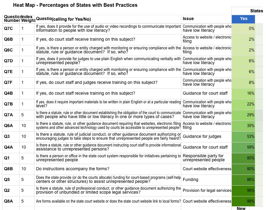 As a general matter, it is notable how many of what I think all would now agree ar e”Best Practices” are scoring relatively low (e.g. 8% training on low literacy communication; 16% training on guidance for court staff on handling SRLs; 53% court guidance for judges.)