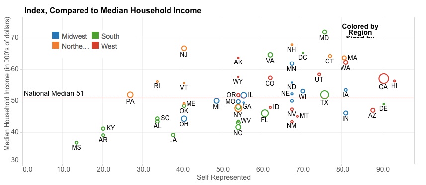Moreover, even the good scores raise questions, as all data should. You can see that 98% of states report at least some forms available — showing that there is a theoretical consensus about the value of forms. (That last state had better get a move on!) Of course this tells us nothing about how many states have anything like the full suite of needed forms. I am deeply skeptical that many do, and take this result more as showing that while the principle is largely accepted, there is still a huge amount of work to be done even in this focused area. Nor does this number deal with plain English, with automation, e-filing, or “mandatory acceptance” — that there is a form for each situation that every court in the state must accept. I am confident that the next version of the Index will delve much more into these issues. This analysis also highlights how valuable the Index is as a beginning point for discussion.