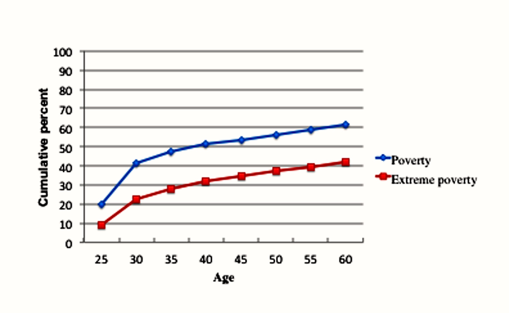 So, by age 60, 45% have received some form of public assistance, 67% have experienced a period of extended unemployment, and 54% lived near or below the poverty line.