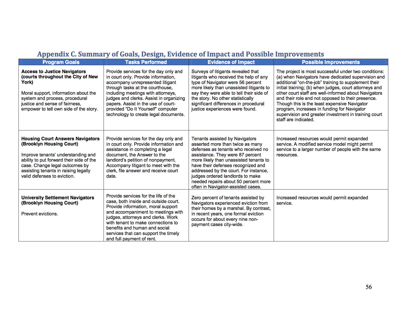 - The Housing Court Answers Navigators Pilot Project involves trained volunteer Navigators “for- the-day,” operating in the Brooklyn Housing Court. These Navigators provide individualized assistance with tenants’ preparation of a legal document, the “answer” to the landlord’s petition for nonpayment of rent, in which the tenant responds to the petition by asserting defenses. Litigants assisted by Housing Court Answers Navigators asserted more than twice as many defenses as litigants who received no assistance. A review of case files reveals that tenants assisted by a Housing Court Answers Navigator were 87 percent more likely than unassisted tenants to have their defenses recognized and addressed by the court. For instance, judges ordered landlords to make needed repairs about 50 percent more often in Navigator-assisted cases.